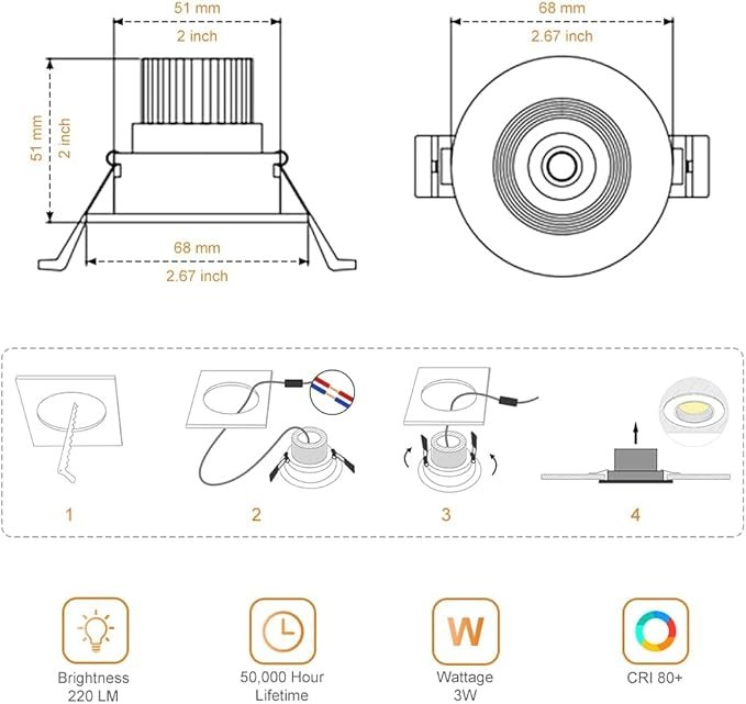 - Unique Design Easy installation: Dia.2.67in(68mm), Cutout Dia.2in(51mm), Directional 60°beam angle, 25°tilt adjustable view angle, Aluminum Alloy Body with Built-in Trim Ring, high safety is no doubtly assured. Directly connect to 110V AC mains without any transformer.The dimmable led downlight can be easily installed without using any tools